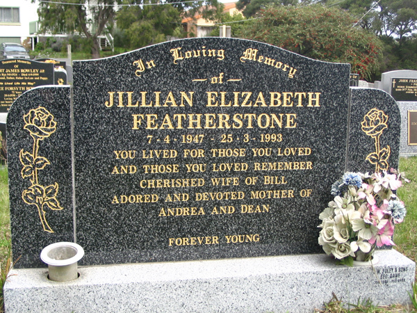 | FEATHERSTONE | Jillian Elizabeth | photo | 7/4/1947 | 25/3/19933 | Bill | m/o Andrea & Dean | ||