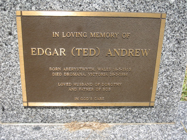 | ANDREW | Edgar (Ted) | photo | 18/5/1913 | 28/2/1996 | Dorothy | born Aberystwyth,Wales,died Dromana Vic,f/o Bob | ||