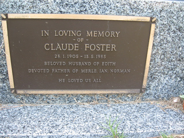| FOSTER | Claude | photo | 28/1/1905 | 13/5/1985 | Edith | f/o Merle,Ian & Norman | ||