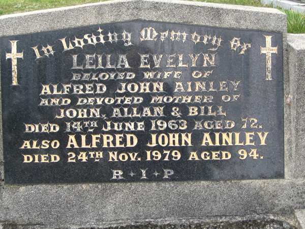 | AINLEY | Leila Evelyn | photo | 14/6/1963 | 72 | Alfred J | m/o John,Allan & Bill | ||
