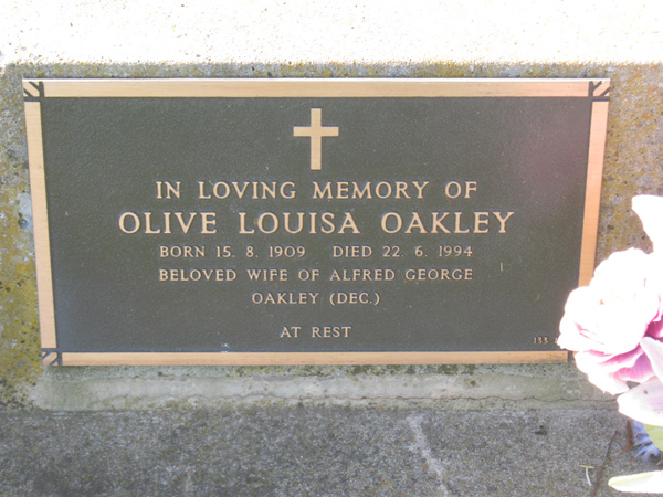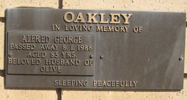 | OAKLEY | Alfred George | photo | 1988 | 83 | Olive | Niche | ||