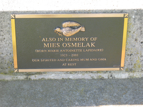 | OSMELAK | Mies | photo | 1923 | 2001 | w/o Janek | born Marie A Lapidaire | Lawn F | |