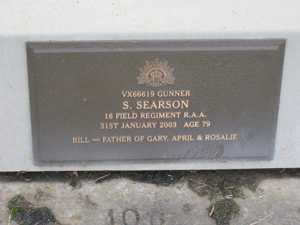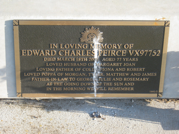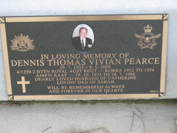 | PEARCE | Dennis T.V | photo | 1933 | 2009 | Catherine | Army Korea 1952-154,RAAF 1974-1988 | Lawn G | |