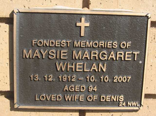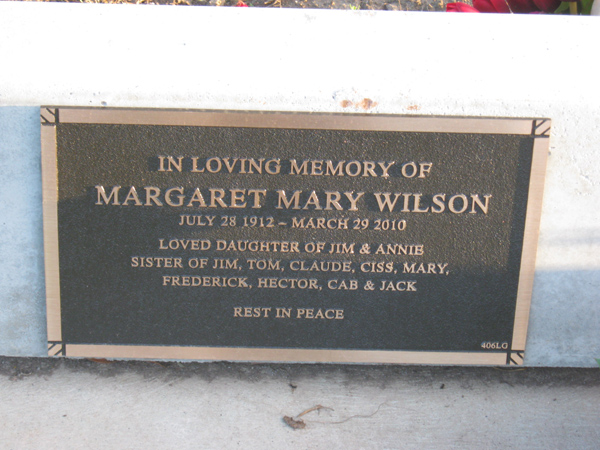 | WILSON | Margaret Mary | photo | 1912 | 2010 | daug/o Jim & Annie | Lawn G | ||