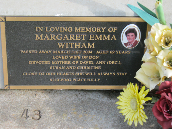 | WITHAM | Margaret Emma | photo | 2004 | 69 | Don | Lawn H | ||