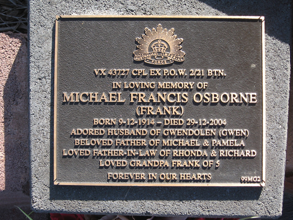 | OSBORNE | Michael Francis | photo | 1914 | 2004 | Gwendolen | Army VX43727 EX P.O.W | M Garden | |