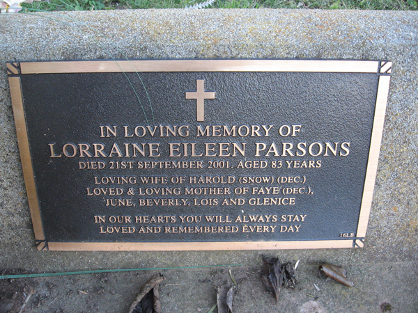 | PARSONS | Lorraine Eileen | photo | 2001 | 83 | Harold L.R | Lawn B | ||