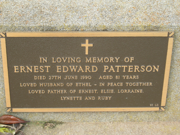 | PATTERSON | Ernest Edward | photo | 1990 | 81 | Ethel L | Lawn D | ||
