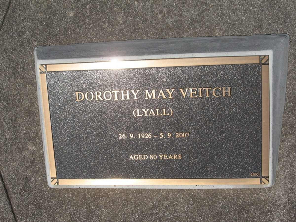 | Veitch | Dorothy May (-Lyall) | photo | photo | 2007 | 80y | 1.K |