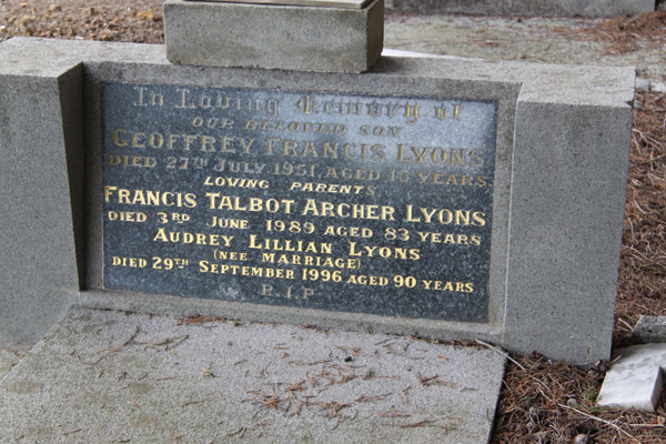 | photo | Lyons | Francis Talbot Archer | 1989 | 83 | Audrey Lillian | |||